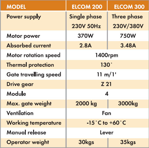 Elcom Industrial operator is an electromechanical geared-motor for sliding gates. It is designed for moving heavy sliding gates or intended for particularly heavy-duty use, and when a high level of reliability is required. This electromechanical units is made up of single/three phase air cooled motor coupled to a non-reversible gearbox and mounted on robust die-cast base. In case of power failure, spring-loaded disengage device is fitted on the gearbox to allow manual operate by rotating the relevant lever.